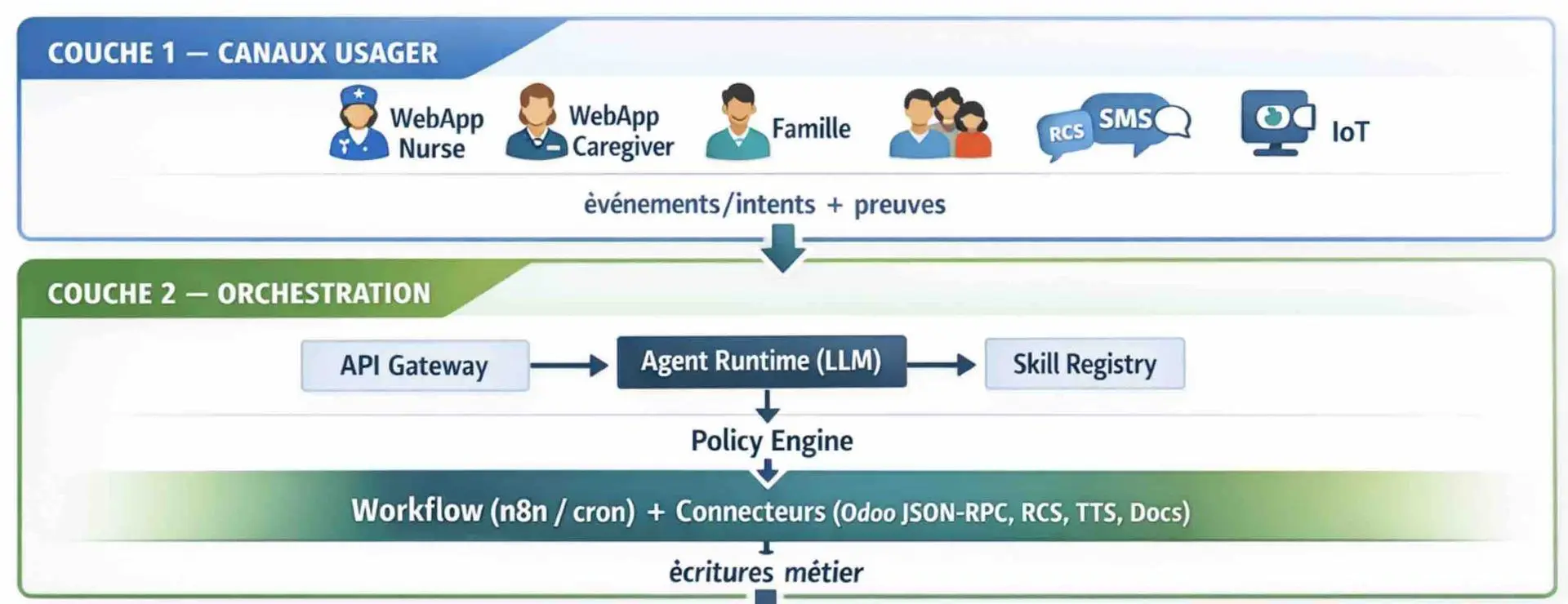 La couche 2 commence par résoudre le senior, vérifier consentements et contacts, puis applique la policy (approval hard ici).