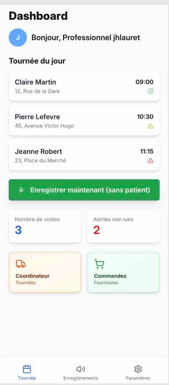 - Timeline visuelle : La "Tournée du jour" liste les patients par heure. Les statuts sont clairs (validé en vert, alerte en jaune/orange).
