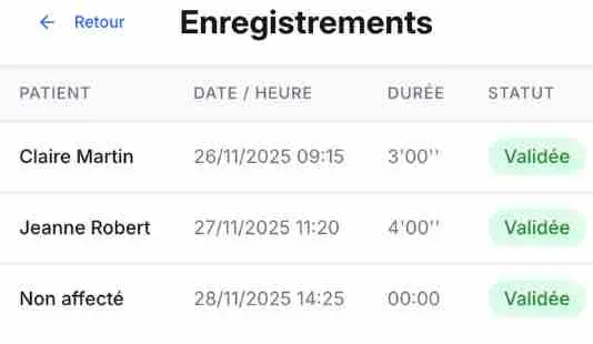 - Points forts : La liste est épurée avec le nom, la date, la durée et le statut. C'est essentiel pour la traçabilité et la facturation potentielle.