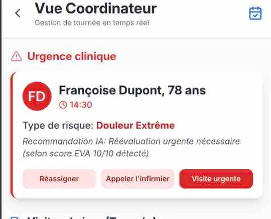 - Actions contextuelles : Les boutons "Réassigner", "Appeler l'infirmier" ou "Visite urgente" permettent d'agir directement depuis l'alerte.