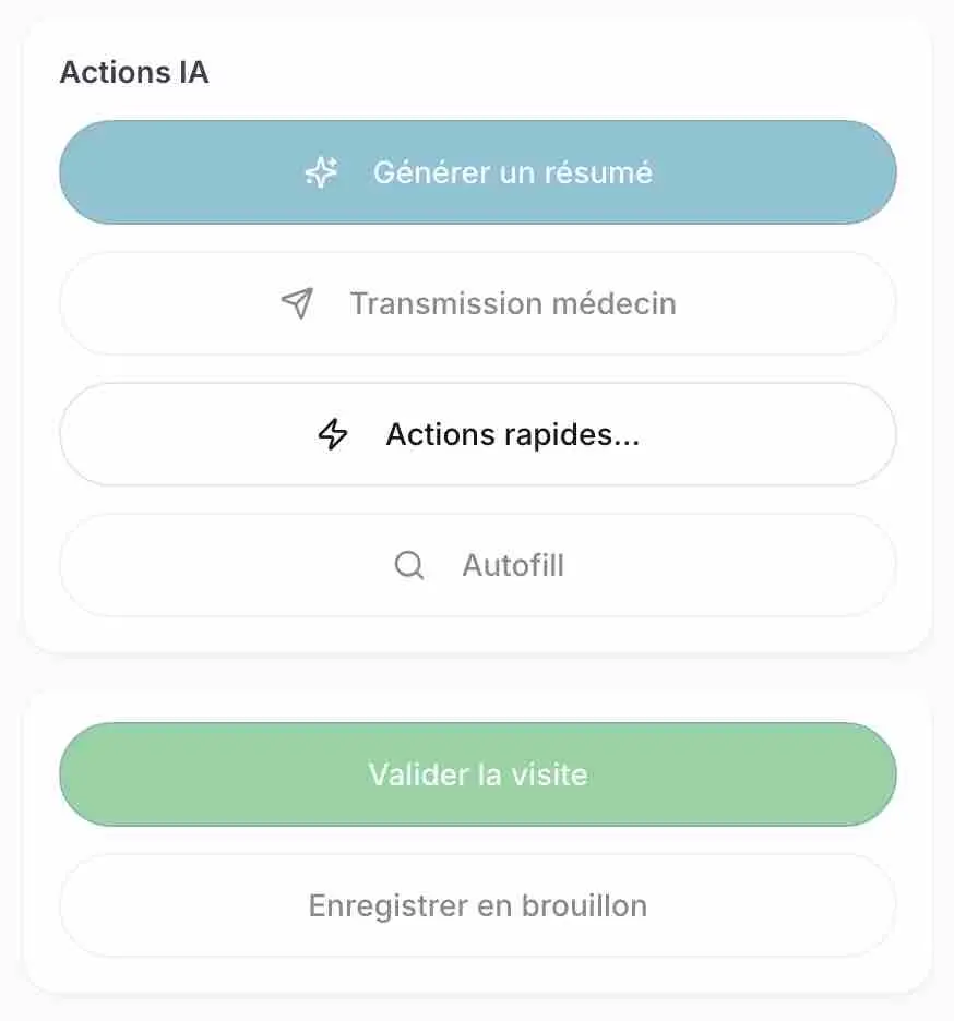 - Fonctionnalités IA ("Actions IA") : Le bouton "Générer un résumé" est un gain de temps énorme pour éviter la rédaction de comptes-rendus manuels. La "Transmission médecin" suggère une interopérabilité.