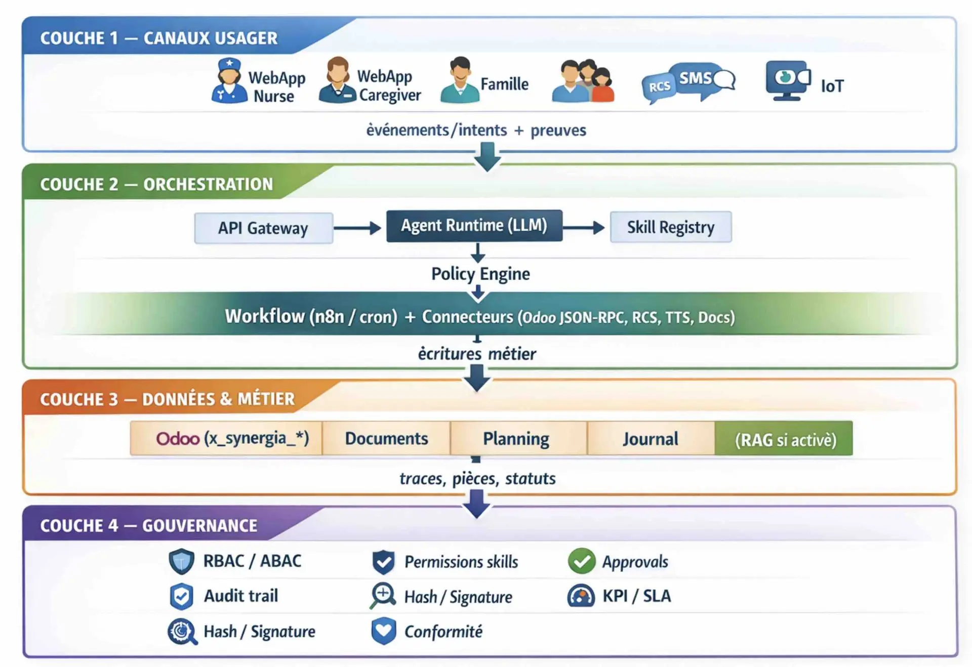 Tout ce qui suit (ex. déclencher une alerte IDEL, écrire dans Odoo, notifier famille, escalader) doit être défini comme Skills Synergia couche 2 avec :