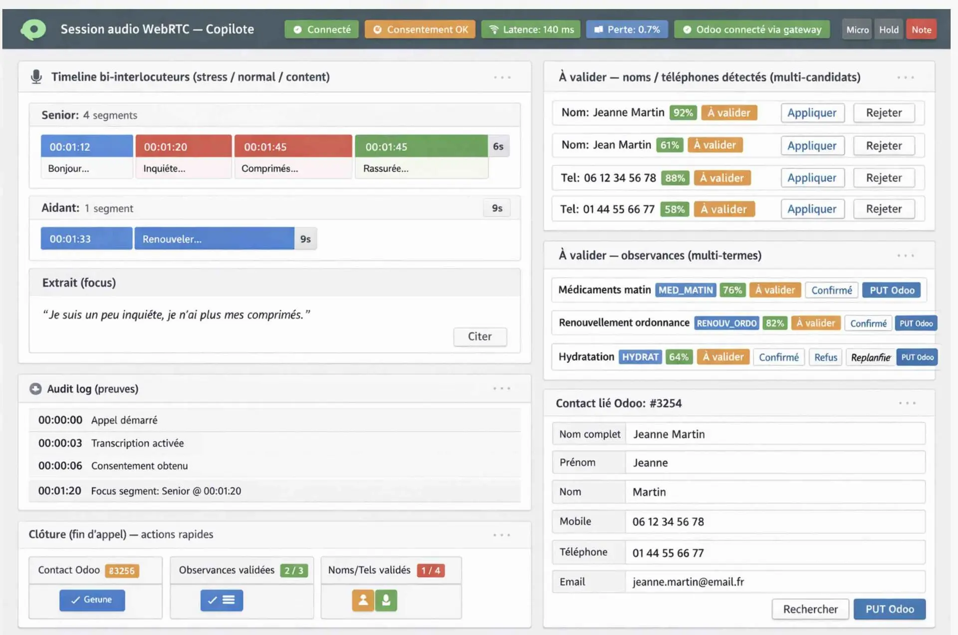 Voici une maquette fonctionnelle React + Tailwind (une page) pour la session WebRTC avec les 4 zones + les 2 panneaux contextuels (“Audit log” et “À valider”), et des stubs d’intégration Odoo JSON-RPC (recherche contact, upsert, création d’événements d’observance).