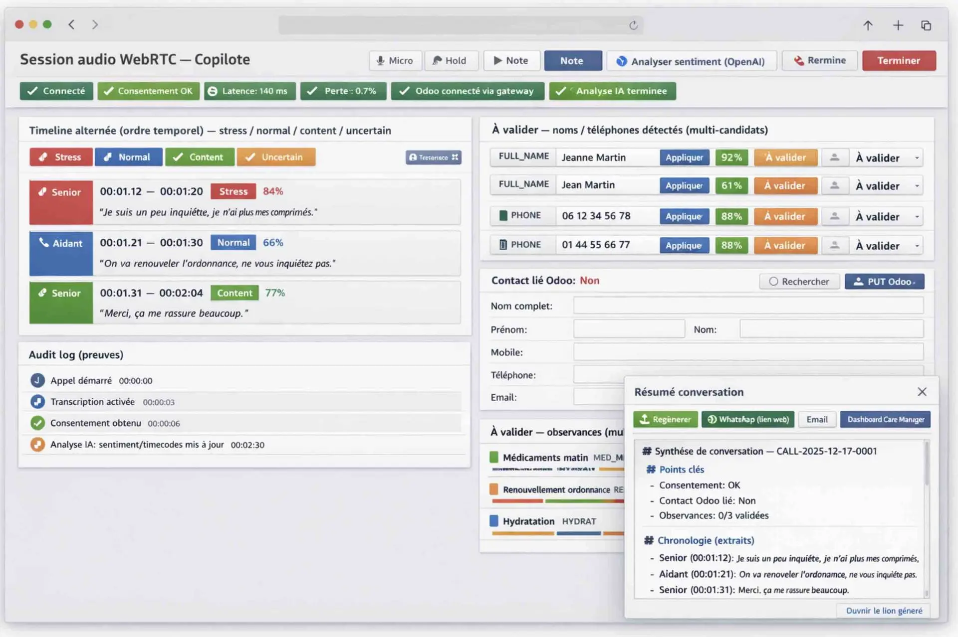 Service WebRTC advanced produit “Call Copilot” orienté conformité + traçabilité,