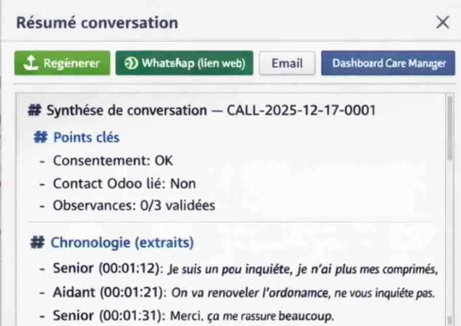 - Valeur opérationnelle immédiate : moins de double saisie, moins d’erreurs de coordonnées, meilleure continuité (le compte rendu est prêt en fin d’appel).