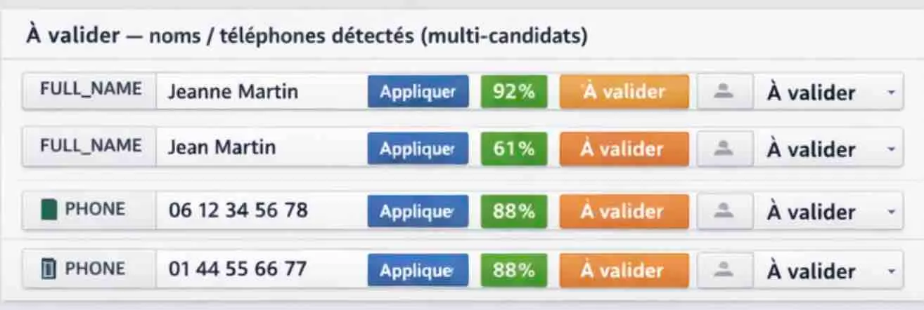 - Ex : “Téléphone détecté : 06… (confiance 62%)” → valider / corriger