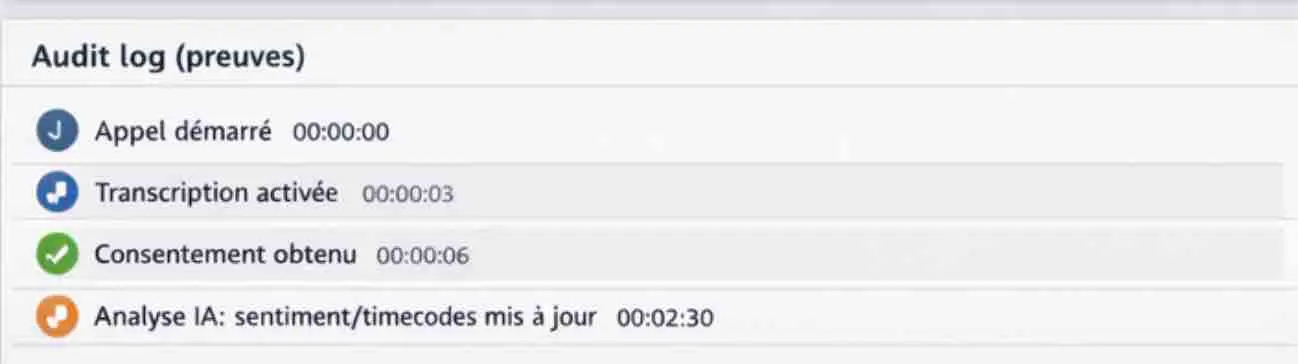- Indicateur “Transcription active” + état “Consentement obtenu”.