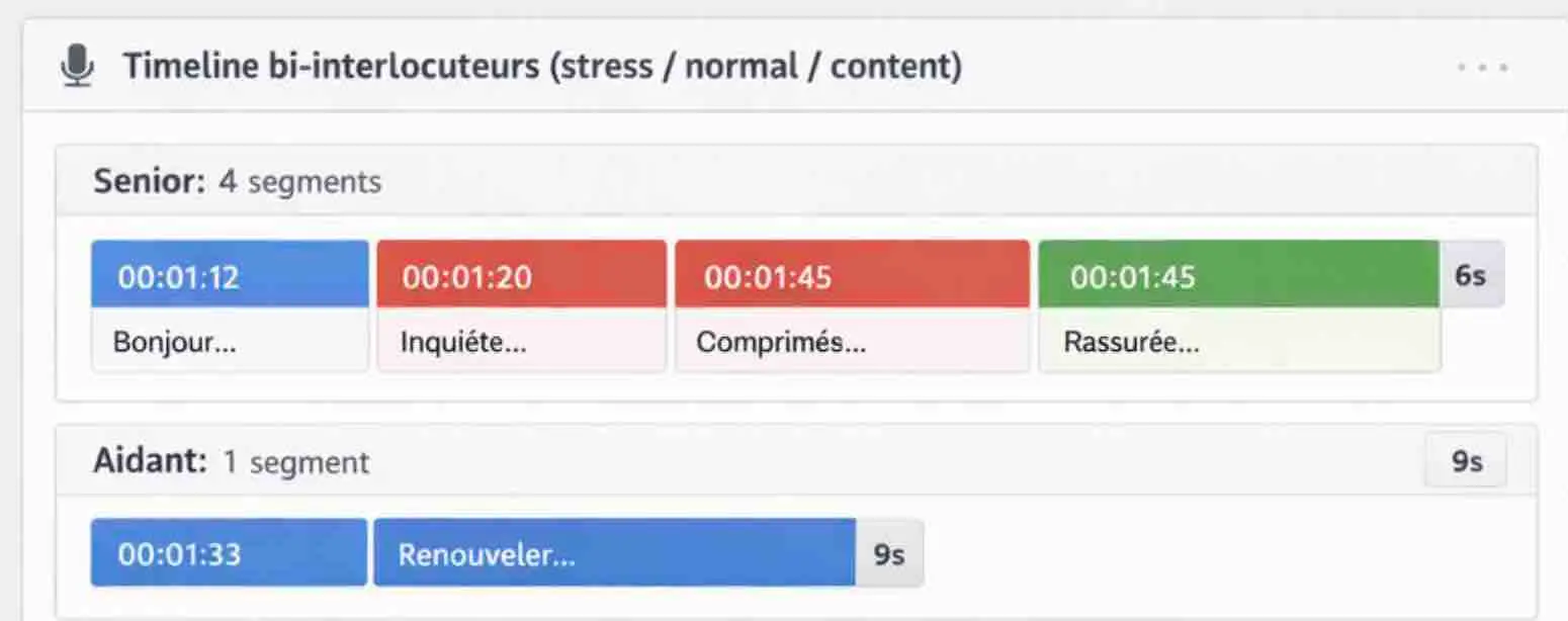 - Timeline alternée (un seul rail) : les segments se suivent dans l’ordre temporel, et l’étiquette “Senior/Aidant” + couleur permet de voir l’alternance naturelle.