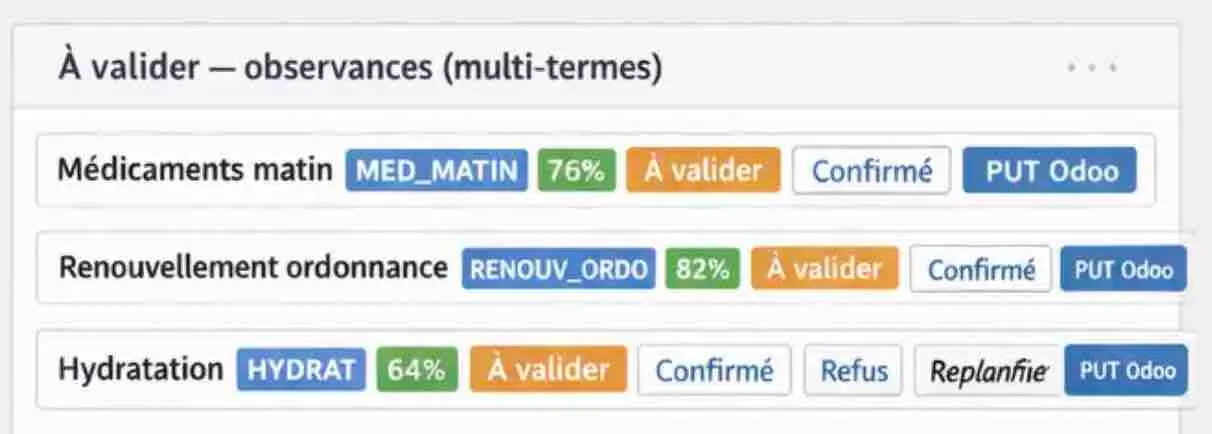 - Niveau d’adhérence (ex. “OK / partiel / non fait”) + raison (fatigue, rupture stock, oubli…)
